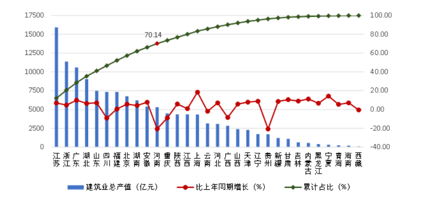 二、2023年上半年各地区建筑业基本情况 (一)建筑业总产值完成情况 2023年上半年,江苏、浙江、广东建筑业总产值均超过了1万亿元,分别达到15916.78亿元、11375.78亿元和10586.19亿元,分别占全国建筑业总产值的 12.03%、8.61%和8.00%。除江苏、浙江、广东外,总产值超过5000亿元的还有湖北、山东、四川、福建、北京、湖南、安徽、河南等8 个地区,上述 11 省市完成的建筑业总产值占全国建筑业总产值的 70.14%。从各地区建筑业总产值增长情况看,24个地区的建筑业总产值较上年同期都有不同幅度的增长。其中,上海的增幅最大,达到了18.44%。宁夏、内蒙古、甘肃等3个地区的增幅在10%以上。7个地区的建筑业总产值较上年同期出现下降,其中贵州、河南的降幅均超过20% (二)各地区在外省完成的建筑业总产值情况 2023年上半年,江苏、北京、湖北3个地区在外省完成的建筑业总产值均超过4000亿元,分别为 6670.07 亿元、4962.70亿元和4046.51亿元。这3个地区在外省完成产值之和占全部在外省完成产值的比重为34.30%。福建、浙江、上海、广东、湖南、山东、陕西、四川、天津、河南等 10 个地区,在外省完成的建筑业总产值均超过 1500 亿元。2023年上半年,17个地区在外省完成的建筑业总产值同比有所增长,增长最快的是宁夏,达到了29.81%。海南、山东的增幅也都超过了15%。从外向度(即本地区在外省完成的产值占本地区建筑业总产值的比例)来看,排在前三位的地区仍然是北京、天津和上海,分别为 73.32%、69.42% 和 55.80%。外向度超过 30% 的还有青海、福建、湖北、江苏、陕西、内蒙古、湖南、贵州、辽宁、山西、河北等 11 个地区(图 2)。 (三)建筑业企业数量、从业人数和劳动生产率情况 2023年上半年,全国建筑业企业数量超过5000家的地区共11个。其中,江苏的企业数量最多,达到13104家。山东、浙江和广东的企业数量均超过 1万家。与上年同期相比,29个地区的企业数量增加,其中,青海增速超过50%,天津、海南的增速均超过25%;吉林、黑龙江2 个地区的企业数量减幅超过10%(图 3)。 2023年上半年,全国建筑业从业人数超过百万的地区仍然是 13 个。江苏、浙江依然是从业人数大省,人数分别达到 684.97万人和 416.60 万人。福建、广东、山东、四川等4省从业人数均超过 200 万人。与上年同期相比,10个地区的从业人数增加,其中增加人数最多的是江苏,增加 37.87万人;18个地区的从业人数减少,其中减少最多的是四川,减少55.00万人。从业人数增幅最大的是西藏,增幅为22.71%;降幅最大的是吉林,下降了21.05% (四)建筑业企业签订合同总额、新签合同额情况 2023年上半年,广东、湖北、江苏、北京、浙江、四川、上海等7个地区建筑业企业合同总额均超过30000亿元,分别达到54142.75亿元、43200.05亿元、39176.44亿元、37001.58亿元、36004.49亿元、31243.04亿元和30146.28亿元。合同总额超过 20000 亿元的还有山东、湖南、福建3个地区。合同总额同比增长最快的是青海,达到了32.80%。海南、陕西、上海和江西的增幅也都超过了15%。9个地区合同总额出现负增长,其中广西、内蒙古的负增长均超过8%